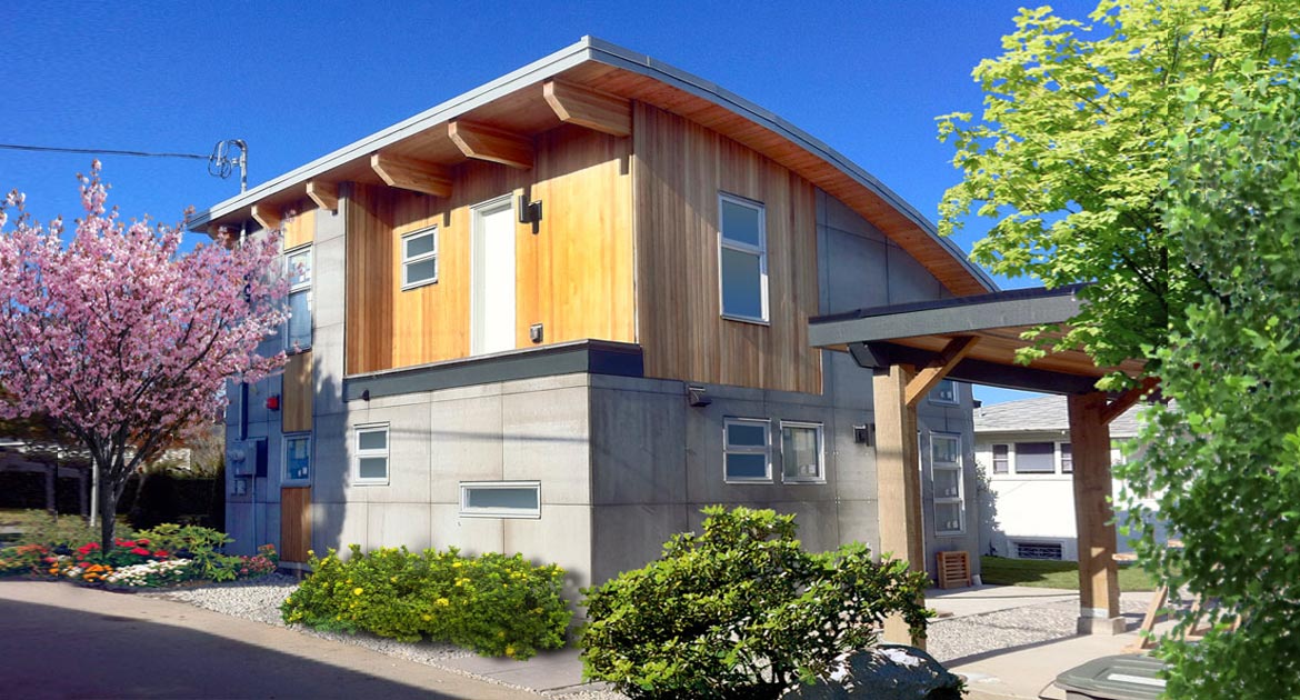 The exterior is finished with cedar siding and recycled composite cementitious board. Rainwater is collected into a rain barrel and is used to water the butterfly garden.