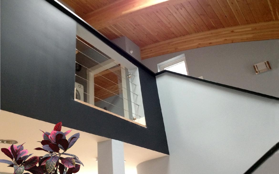 A curved roof form represented the organic nature of sound, and the amplification of sound. The roof form, akin to a concave mirror, helped distribute daylight from a skylight over the stairwell. Living, dining, kitchen and a bathroom were placed on the main floor. The second floor has two bedrooms and a full bathroom, with two exterior deck areas. The open floor layouts helped create a sense of spaciousness.